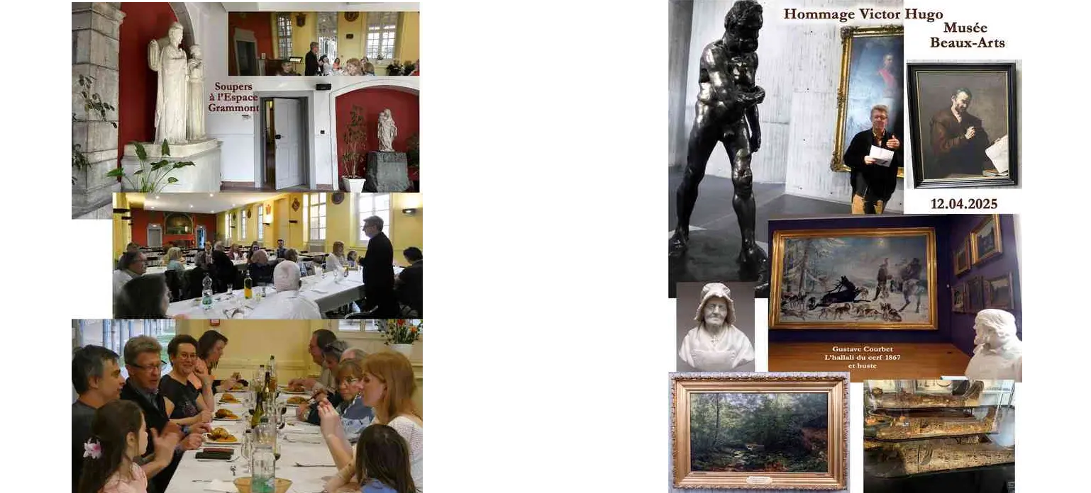Un vibrant hommage fut rendu au grand poète pour la troisième année par Annick Gautheron dans sa maison natale. La salle voûtée appelée « Gavroche » se prêtait on ne peut mieux aux propos 2025 « Victor Hugo et Notre- Dame de Paris, sa renaissance le 8/12/2024 ». Commençant par Notre-Dame, le monument, Annick rappela les incendies d’avant celui du 15/04/2019 : ceux du 29/07/1830 et 14/02/1831. Elle fit ressortir les destinées croisées avec cette Cathédrale gothique d’Eugène Viollet-le-Duc (1831) et Philippe Villeneuve (1980), tous deux âgés de dix-sept ans ! Puis, revenant sur le roman de Victor Hugo, de ses difficultés de conception, aux critiques mitigées des écrivains, journalistes, à sa sortie, ponctuées de lectures par Jean-Pierre Jacquemin, dont un extrait du roman sur l’incendie de Notre-Dame. Rappelant aussi que, cet enfant non baptisé et père n’ayant pas souhaité faire baptiser ses propres enfants, était pourtant profondément croyant : « Je refuse l’oraison de toutes les églises. Je demande une prière à toutes les âmes. Je crois en Dieu ».