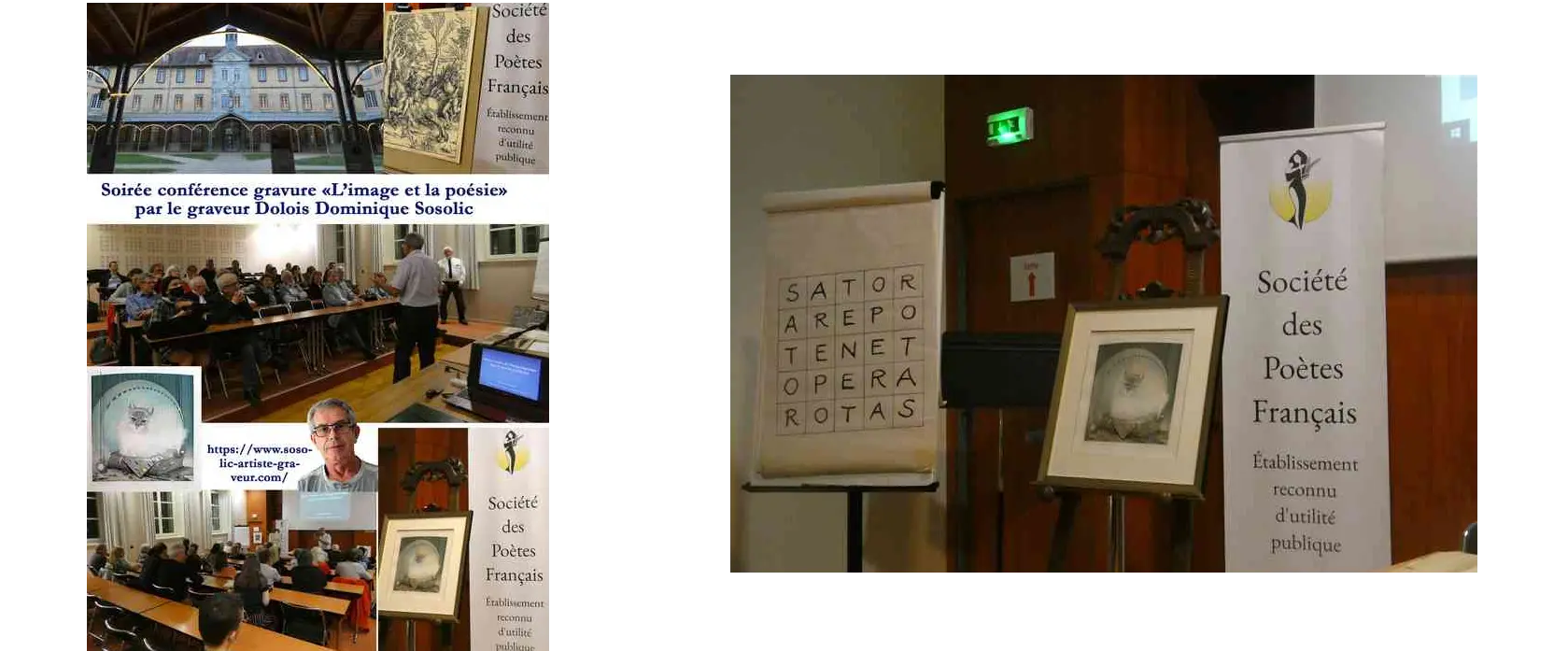 * De nouveau, un excellent souper dans la salle à manger du Centre Diocésain, en compagnie de Mr Sosolic et de son épouse, avant sa conférence : « Image et Poésie », sur la gravure, l'estampe, les outils, son métier de graveur. Dominique Sosolic. https://www.sosolic-artiste-graveur.com/vente-estampe-dominique-sosolic-graveur. Artiste Dolois d'exception, reconnu internationalement, dont la devise est : « L'artiste, c'est une main d'ouvrier, un cœur de poète, un cerveau de philosophe ». Il nous expliqua le cheminement créateur qui l’a conduit à sa gravure représentant l’écriture, intitulée « Sator », faisant partie du triptyque avec Requiem et Espace-Temps (musique, mathématique, écriture). Chacun put découvrir ses œuvres.