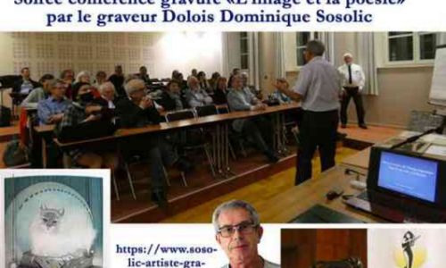 * De nouveau, un excellent souper dans la salle à manger du Centre Diocésain, en compagnie de Mr Sosolic et de son épouse, avant sa conférence : « Image et Poésie », sur la gravure, l'estampe, les outils, son métier de graveur. Dominique Sosolic. https://www.sosolic-artiste-graveur.com/vente-estampe-dominique-sosolic-graveur. Artiste Dolois d'exception, reconnu internationalement, dont la devise est : « L'artiste, c'est une main d'ouvrier, un cœur de poète, un cerveau de philosophe ». Il nous expliqua le cheminement créateur qui l’a conduit à sa gravure représentant l’écriture, intitulée « Sator », faisant partie du triptyque avec Requiem et Espace-Temps (musique, mathématique, écriture). Chacun put découvrir ses œuvres.